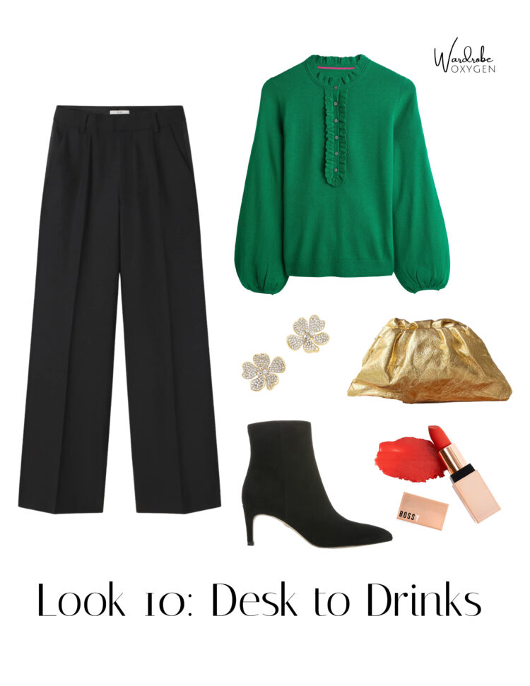 I only made one look with the pants alone because I think it's far easier to create looks with pants than a blazer. Essentially any piece that can be tucked in (half tucks are included) or is short enough to not hit the mid-hip area so you have some shape is a good option to wear with these wider-leg pants. A turtleneck, a cropped cardigan over a camisole or shell, a blouse, a graphic t-shirt and leather moto jacket… these pants are begging for you to get creative. Here I kept with the holiday theme with festive green, a bright red lip, and accessories with shine.