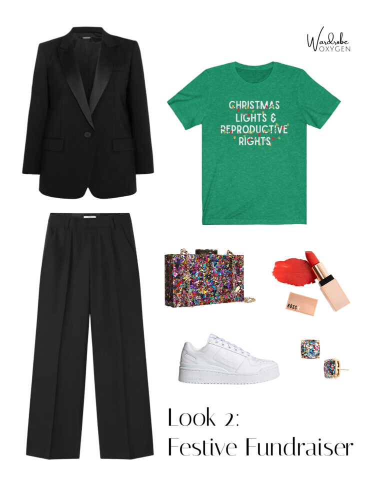 Invited to a fundraiser that's at a nice location but you feel that little black dress is too prim and proper but you don't want to be underdressed? Balance the glam of your lady tux with a graphic t-shirt showing what you stand for. Also fun for a party at one's home, this mix of elevated and casual feels modern and comfortable. Keep it fun with a confetti-inspired bag and earrings. And these sneakers I own and find them comfy on my wide feet and cool looking too. If you want to see an example of me wearing a dressy suit with sneakers, check out this post.