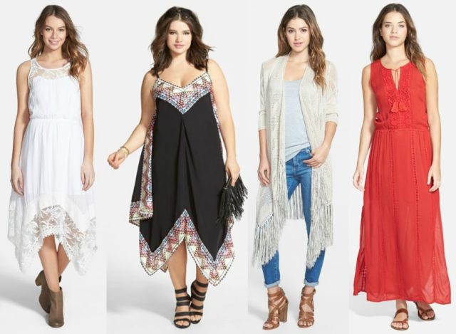 Sun & Shadow Handkerchief Hem Dress, City Chic ‘Festival Border' Dress, NIC + ZOE Fringe Cardigan, Hinge Lace Trim Maxi Dress