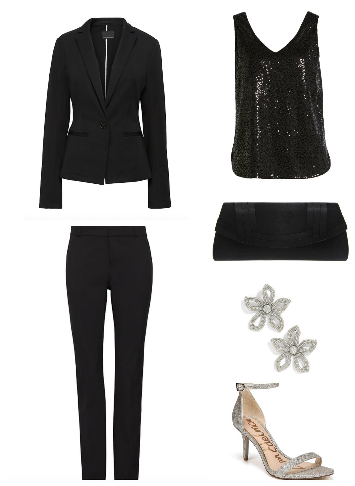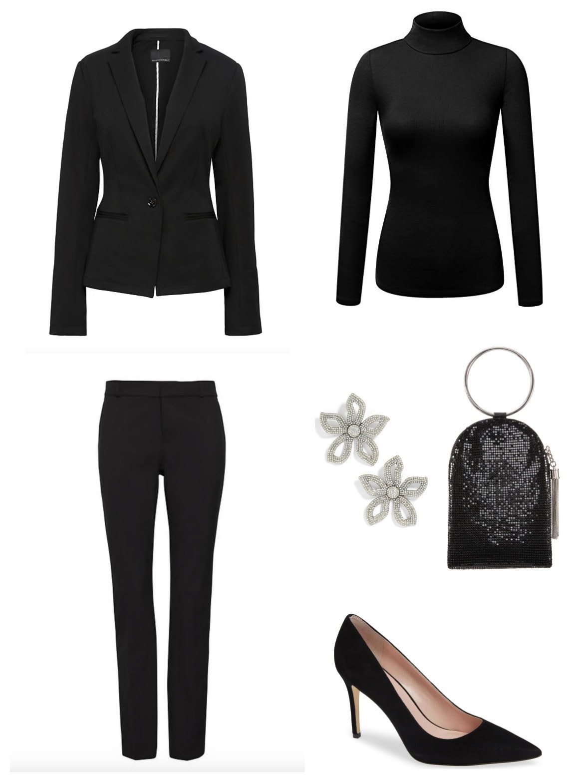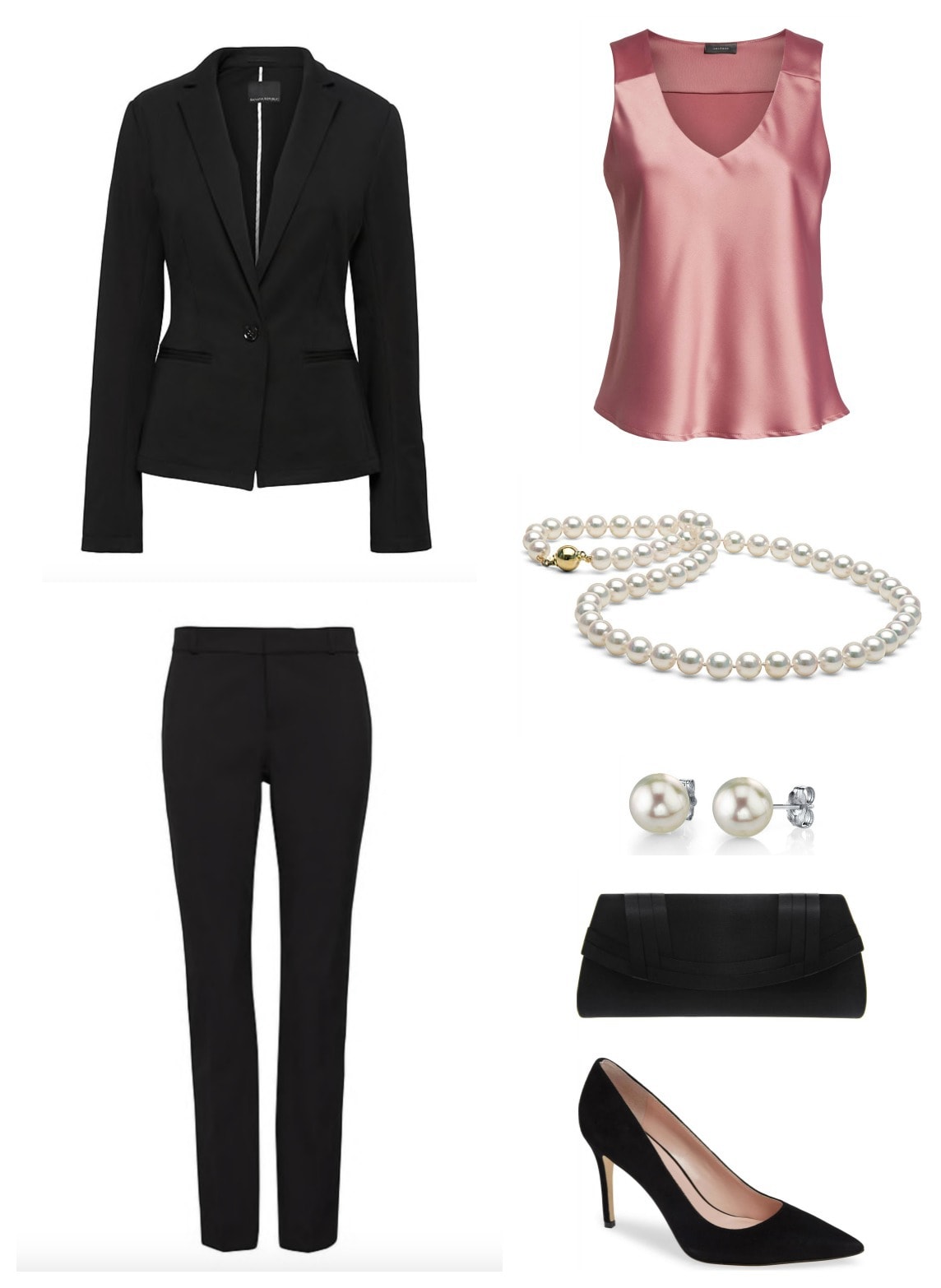 - Black Pantsuit. One button, straight ankle-length pants, seasonless fabric like tropical weight wool, triacetate, or crepe.