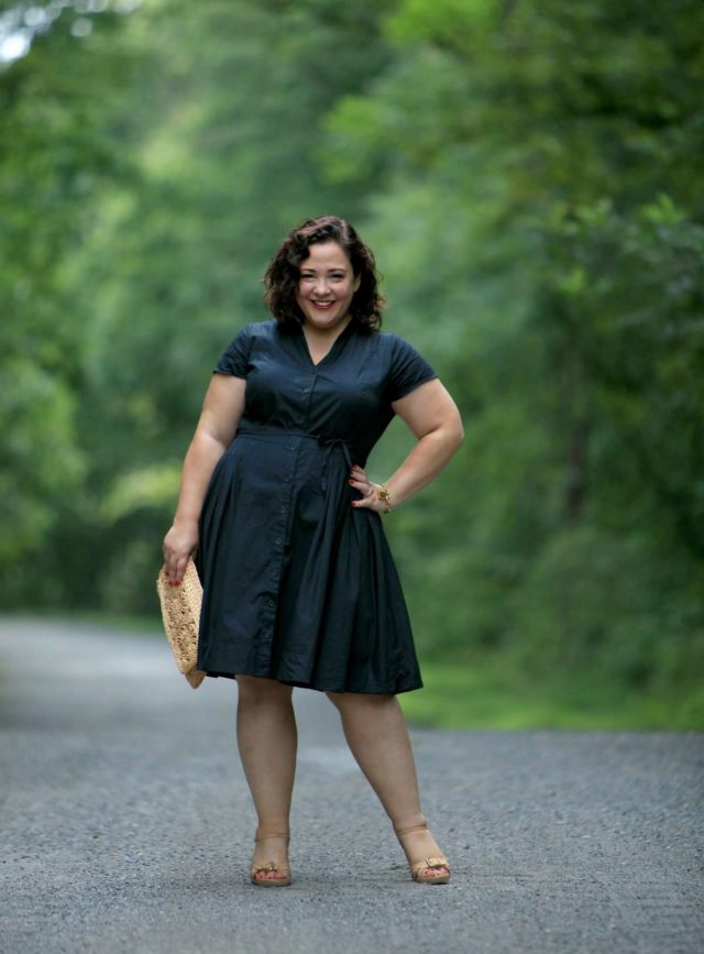 Wardrobe Oxygen in a black cotton shirt dress from ellos with Aerosoles wedge sandals and a raffia clutch bag I had a dress similar to this one years ago (see it here), but I literally wore it to death.  It got faded, threadbare in places, and I had replaced lost buttons multiple times.  It was such a perfect dress, it became my uniform back when I'd be Karl's assistant on wedding photo shoots.  I'd clamp a fanny pack on, fill my pockets with batteries and memory cards, and run around capturing shots, smoothing trains, and wrangling relatives.  I was sad to donate the dress, I never thought I'd find something similar until I saw this one at ellos.  This dress comes in five different colors/prints and goes from size 10/12 to 38/40.