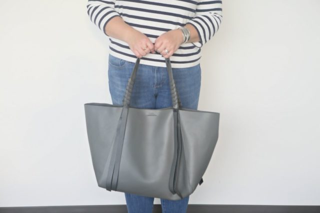 I love ALLSAINTS bags. Last year I invested in the North/South tote and that bag is sooo worth the money. It's gorgeous, durable, the perfect size, and looks expensive without being all covered with logos. This bag is the same. The leather is thick enough to survive all sorts of things but still supple and with that perfect bit of sheen. The color is so cool, like fog (if this isn't your thing the bag also comes in black). I love the subtle details – the tassels, the braided trim on the handles. There's a magnet closure and the size is comfortable under my arm even if I'm wearing a thick coat or the bag is filled to the brim. Even with straps long enough for comfort, I can carry it in my hand and it won't drag on the floor. This could be a great work tote, just slip a neoprene laptop case in there and you'll still have room for your change of shoes, lunch, files, and purse essentials without it getting lumpy. And if I didn't have my North/South tote I'd get this one. And I like it so much I am tempted to keep it, but that wouldn't be a smart purchase. But gosh it's pretty. One of you get it, love it, send me photos of you all over town with it so I can live vicariously through you. This bag retails for $368.