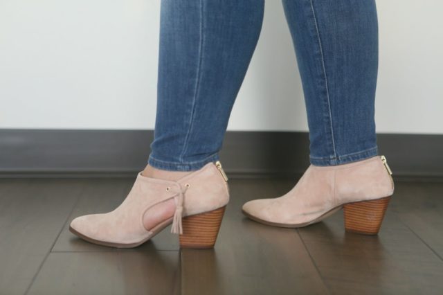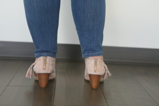I love the look of a suede ankle bootie in a low-contrast color. They're so versatile. Wear with dresses and elongate the leg, look chic with jeans. However, as one with not just wide feet but wide ankles, it's hard to find booties that don't create a muffin top on my ankles if they can even zip up completely. I had a pair of beige suede ankle booties from Clarks but they were worn to death and retired. So I was excited to see these booties in my Trunk. And these fit… dare I say they're too wide (I NEVER say such a thing). They're also super comfortable. However, they're not right for me. The cutout looks cool… but then how do you wear socks to keep your feet from funking up the booties and to keep your feet warm as the temps drop? Also the tassels bother me. I think the back view is weird with the zippers and the tassels and the stacked wood heel… it's a lot for what I want to be a low-contrast neutral shoe. I think I'd appreciate these details more in black (this bootie comes in black as well as this blush color). So while these made me super excited because they fit, they're going back. This bootie retails for $124.95 and comes in narrow, medium, wide, and extra wide widths.