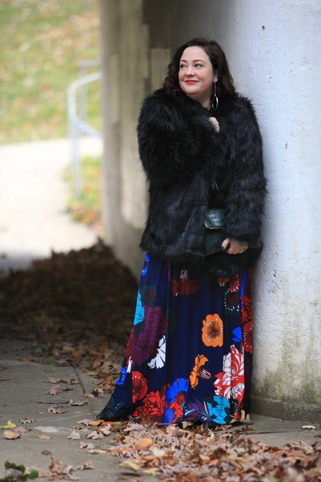 For this shoot, I added this phenomenal faux fur coat from Ellos. I like that it's a bit longer than a lot of the fur “chubbies” that are for sale this season. It makes it look more elegant and is more flattering too. The fur is really nice on this, clearly faux but not in a cheesy or cheap manner at all. It has large black snaps for closure that hide in the fur so it looks great open or closed. I continue to be impressed with Ellos, and I love their size range and prices!