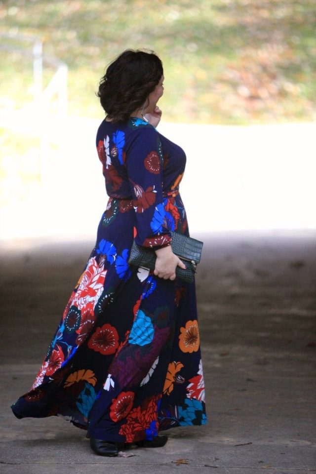 You look fantastic in this dress! I love, love, love the look of a beautiful maxi dress and this one surpasses all my expectations. The flowing skirt, the ultra-bright floral print and the long sleeves make this a winner in my book.