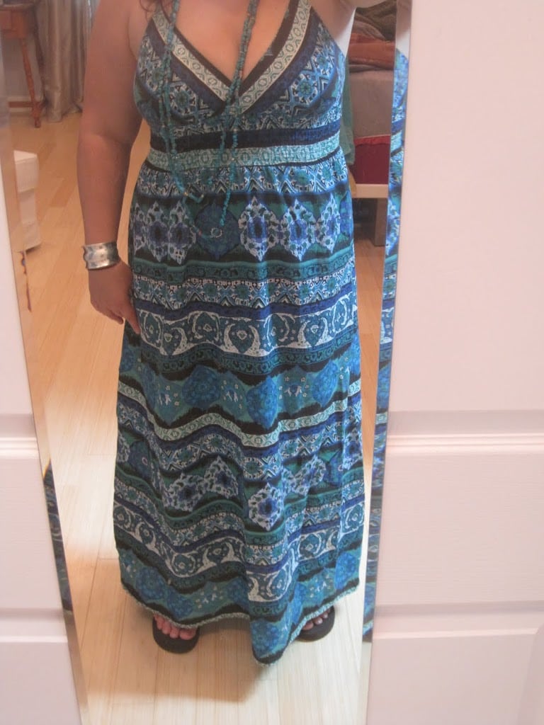 I wore my blue print maxi dress that I got at Ross for Bonnaroo, my two turquoise bead necklaces from H&M (restrung to make them longer and add the occasional random bead), silver cuff, black flip flops. Tres casual, but the local arts center is a very casual place. Our friend was fantastic, the show was awesome, and we had a great time celebrating with him and other friends afterward.