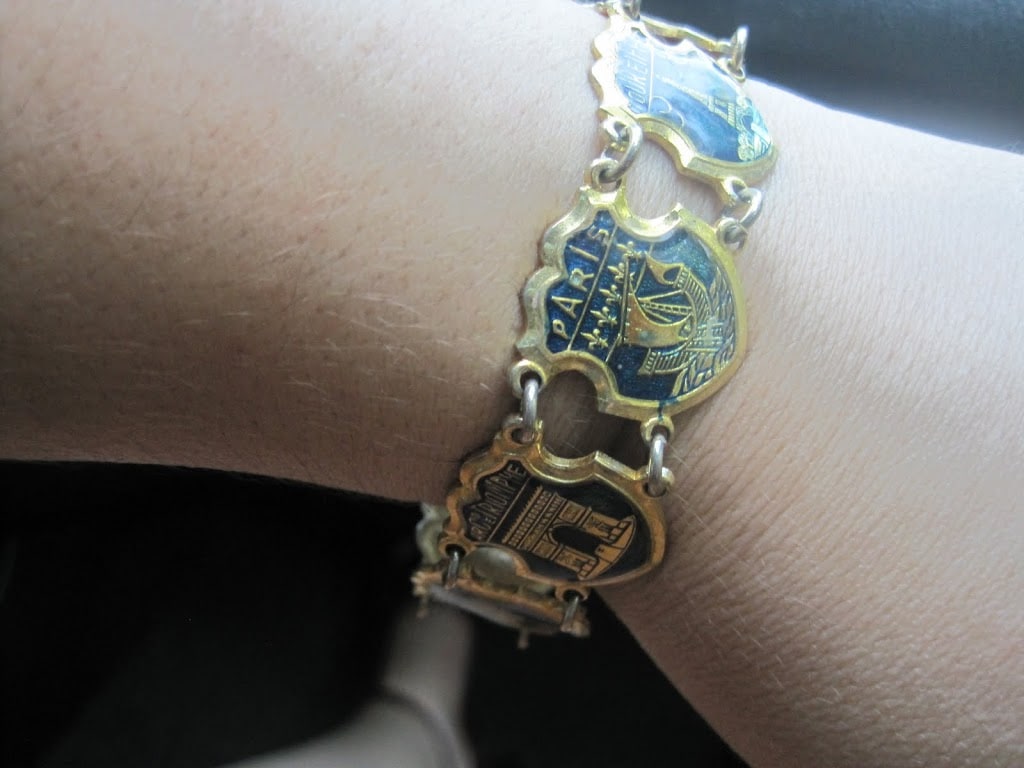 Instead of my standard silver cuff, I am wearing a blue enamel and gold bracelet my dad brought home from France in the '80s. Very typical tourist piece (each plaque has a famous Parisian landmark) but I adore it, and I think it fits the look of the dress and shoes.