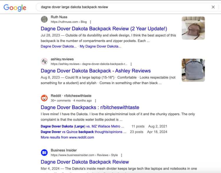 When I feature a product on Wardrobe Oxygen, I often can’t find a usable image on the retail site. I type in the entire product name (ex. Large Dagne Dakota Backpack) and then go to the “Images” tab of my search engine. Here, I will find the images from the retailer site, but also images of bloggers and social media influencers wearing or featuring the product, eBay and Poshmark listings with this product, news articles that mention the product, and occasionally other retailers that also sell this exact product.