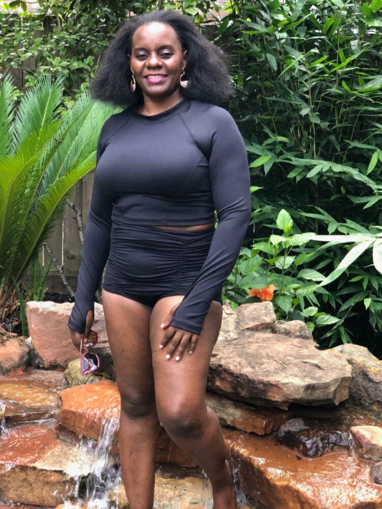 I chose the Ruched High Waisted Bikini Bottoms and UVP Crop Rashguard. I ordered a size medium and I am usually a size 8 in most clothing brands. I chose the rashguard because I wanted to cover up when I was out with my son because we can be exposed when we are in the hot Texas sun for a long time. I really liked the crop look and I thought it would add a touch of sexiness to the outfit.