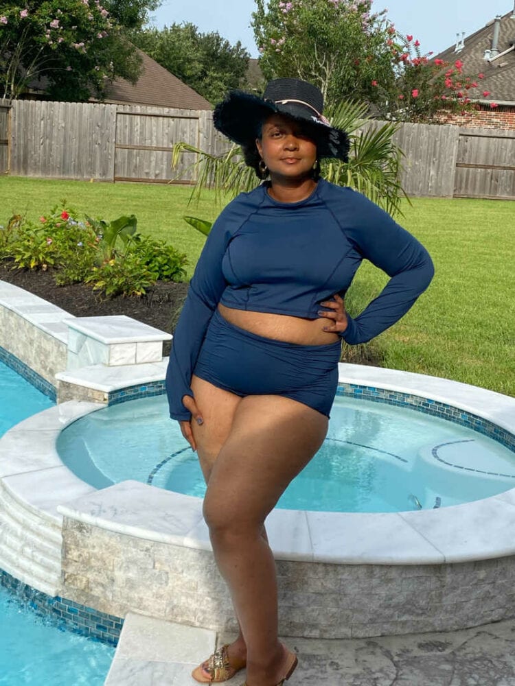 My swimsuit pick was the Ruched High Waisted Bikini Bottom, size 1X, in the color Indigo, along with the Scoop Neck Swim Top, size 2XL, in the color Rose. I love a mis-matched swimsuit, and a high-waisted ruched bikini bottom is my go-to first-choice; I knew both pieces would go with some of the other swimsuits in my collection. The bottoms only come in Black and a Dark Teal, and I think there is an opportunity for there to be brighter colors available.