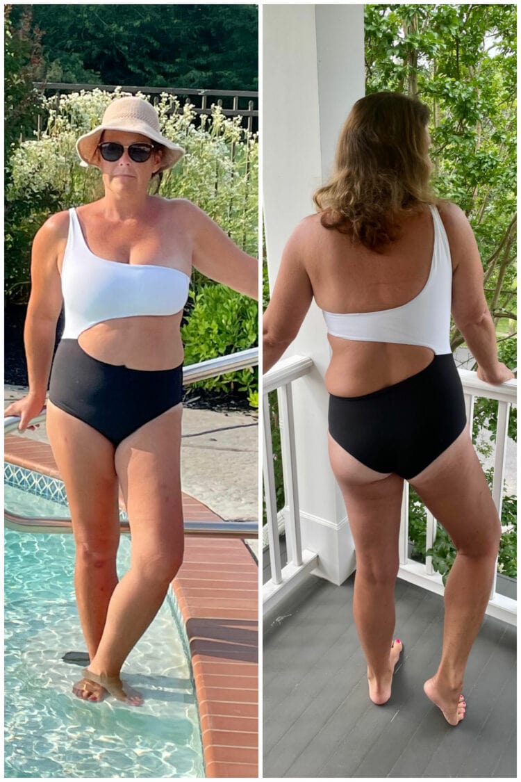 I am Erin, 48 years old, located on the east coast. I ordered the peek-a-boo one-piece classic because it looked fun! I love the classic look of black and white and thought it offered just enough coverage to not be self-conscious if a neighbor caught a glimpse of me in our backyard pool. I used the measurement chart to choose my size (XL), but after trying it on, I wish I had sized up! For reference, the suits I currently wear most often are Jantzen one-pieces (size 14), and a Target tankini (large). In the past, I have liked Lands End suits in 12/14 Long due to my long torso.