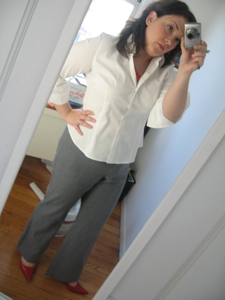 I thought my outfit was pretty cute yesterday but didn't get a picture. My black and white striped scoop tee from Ann Taylor, black pencil skirt from Ann Taylor, my wide black belt with the patent buckle… also from Ann Taylor, and my black peeptoe booties from Miss Sixty.