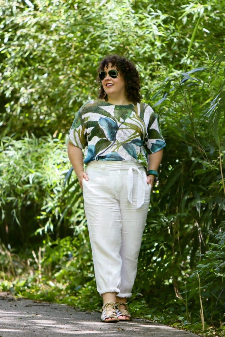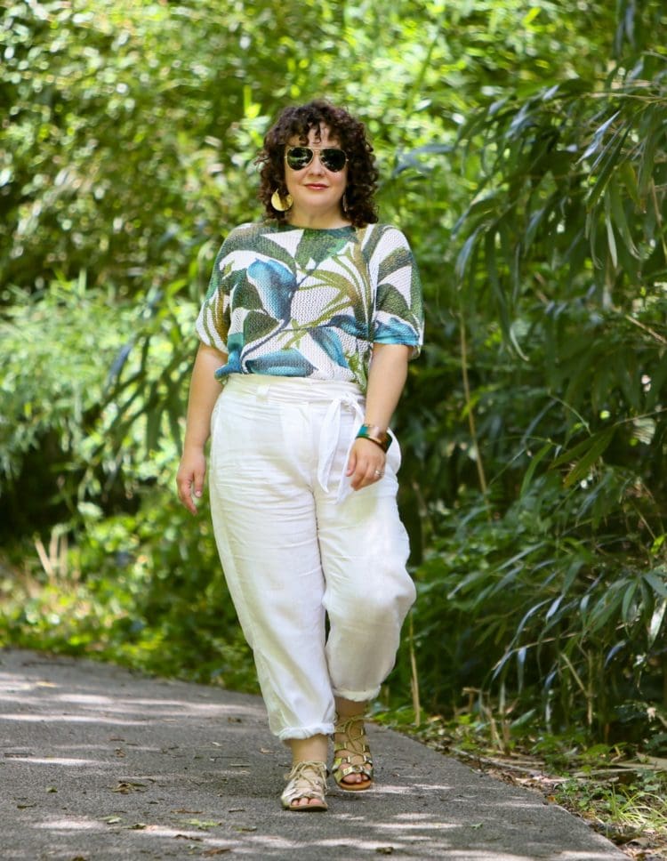 Sweater: Palm Print Open Weave Sweater c/o Chico's (size 2) | Pants: Linen Tie-Front Crops c/o Chico's (size 2) | Bracelet: Wide Blue and Green Wood Cuff Bracelet c/o Chico's | Earrings: c/o Chico's (sold out; similar) | Shoes: Bella Vita (old and no longer available, similar concept) | Lipcolor: Aragon from NARS | Sunglasses: Ray-Ban