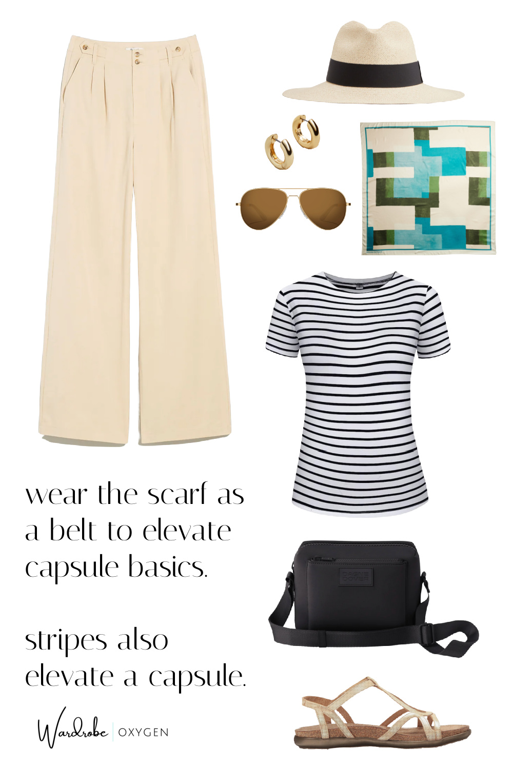 - An oversized silky scarf is a quick way to elevate a look by using it as a belt. The one I included I own in a different print, you can see it as a belt on me here with the same pants in this capsule. I also wear this scarf as a headscarf, I've tied it around my neck, it's big enough to throw over shoulders for sun protection… it's a travel must for me.