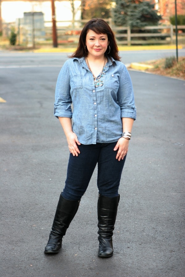 Teal cotton babydoll top from Old Navy, black stretch poplin trousers from Caslon, gray-green glass bead and silver necklace from Target, silver cuff, black leather thong heels from Mossimo.