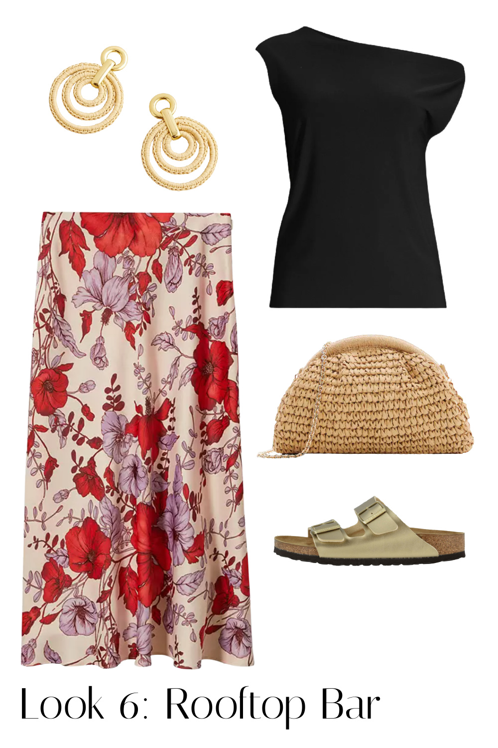 black tank dress | print dress | white linen shirt | black t-shirt | white tank | black off the shoulder top | floral skirt | black joggers | print pants | black swimsuit | fan | olive sunhat | sunglasses | canvas tote | folding water bottle | pink tote | raffia clutch | cotton bandana | statement earrings | white sneakers | flip flops | gold Birkenstock sandals | carry-on suitcase