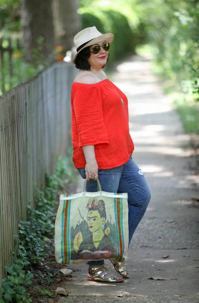 When summer comes I want loose, breezy, and preferably natural fibers. I took a risk with this Michael Stars top as their Large is supposedly an 8/10 and their ‘Samba' color looked like a brick red. I was psyched to find this 100% cotton top is not only plenty big for my size 14 busty self but the color is a vibrant orange-red color! Unlike the off the shoulder top in this post, this neckline is elasticized and can be off the shoulder, off one shoulder, or worn up. Here I'm wearing it with a pair of girlfriend jeans, but this weekend I also wore the top with a pair of old beat up denim cutoffs. It's not a top for figure flattery, but in the dog days of summer, comfort and coolness trumps a whittled waist!