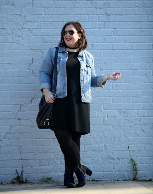 I bought this dress during the Nordstrom Anniversary Sale and loved it… except for the length. I'm only 5'3″ but the XLP was utterly indecent. Funny, after I ordered it I went back and Nordstrom changed the description from dress to tunic. I exchanged it for a Large Regular and wore it… and the whole side seam unraveled while I was at work! So glad I was wearing it with leggings and had a cardigan hanging on the back of my door. Call me crazy but I went and exchanged it for a third one, again in Large Regular. This one is both wider and longer than the previous LP, which was perfect in length and size and far more durable. This is the perfect fall to winter go-to dress. I wore it in September with bare legs and my tan Clarks suede booties, have styled it with my heeled knee-high boots, and here have it more casual with my denim jacket, tights, and these new ankle boots from 7 Dial Shoes. It's relaxed enough of a fit that I can layer underneath when the temps drop and light enough to layer over it without turning into the Michelin Man.