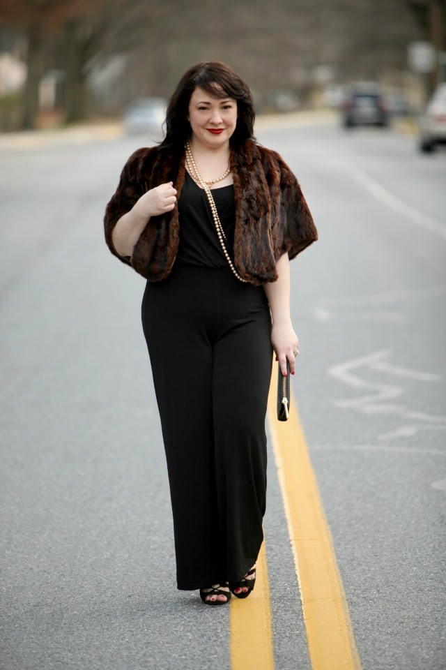 Jumpsuit: c/o Karen Kane (same but in black and white) | Stole: Vintage (similar) | Necklaces: Nordstrom, Nordstrom | Clutch: c/o Dagne Dover | Lipstick: Revlon ‘In The Red' | Shoes: Christian Siriano for Payless ‘Mayhem' Ghillie Pump c/o Payless ShoeSource