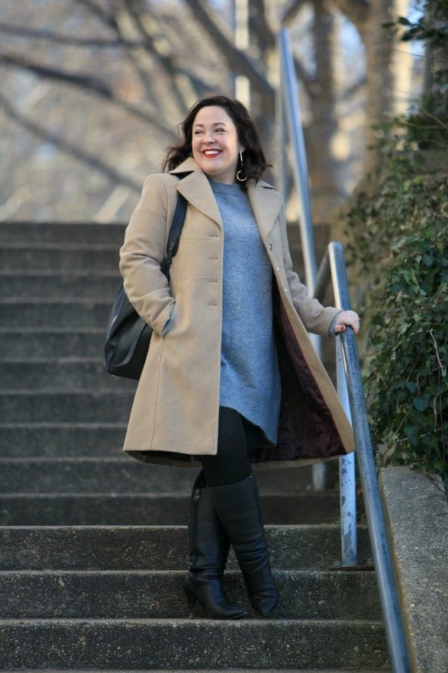 This sweater dress is purposefully oversized and really soft and cozy. Because it's oversized it's easy to layer underneath for more warmth. I love wearing full slips under sweater dresses so it doesn't cling and also it helps fight wind. Fleece tights are my go-to in winter; they aren't as stretchy as traditional tights so I usually size up so I don't end up with my crotch near my knees by noon. These boots are a decade old. The elastic is a bit shot, one zipper won't unzip, and they've been reheeled and resoled more times than I can count but I don't retire them because I have yet to find anything quite as perfect. I had these tailored to better fit my legs, but they're real leather, lined, a comfortable heel height, a slim heel, and an almond toe. Classic and chic, I have no idea why boot retailers don't make this style more often!