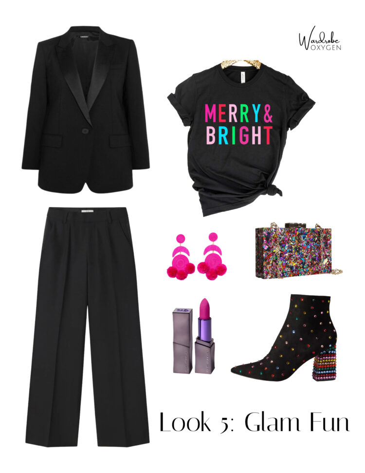 Who says black has to be boring? Who says a suit needs to be conservative? Take that lady tux and glam it up for a super fun occasion. Here I have a holiday-themed t-shirt, but you could switch it out for your favorite band, the team shirt for your girls' getaway, a bachelorette, or a different holiday. The black base gives you room to be a bit bolder with your accessories. I couldn't resist sharing these super fun boots, and love the idea of switching out typical red lips for the holidays with a bold pink that matches these adorable earrings that will be fun to wear all year long.