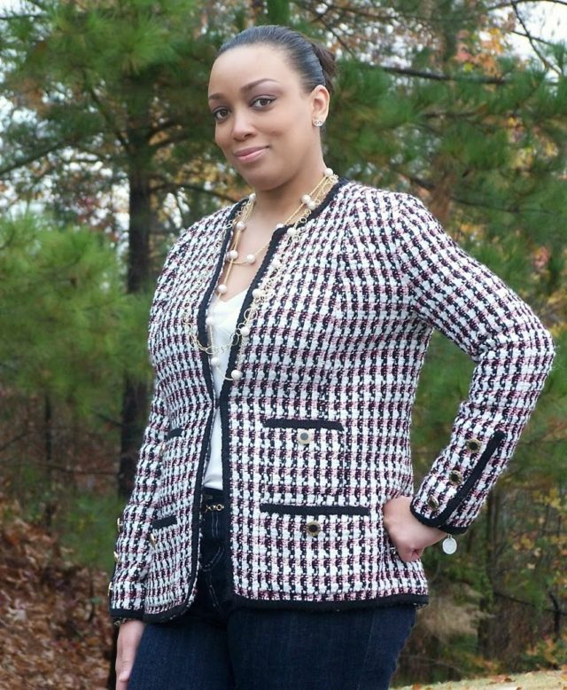 The Soft Jacket โ I have a black collarless ponte-knit jacket I got at the Banana Republic outlet a couple of years ago. It has large black buttons, bracelet-length sleeves, hits right at my waist. The neckline is wider than that of the Classic Cardigan, the heavier fabric gives more shape, but the knit is still comfy and kind to my curves. I wear it open to create a vertical line down the body which slims. I have paired this with a white ribbed tank and jeans, a sleeveless sundress and peeptoes, and even with ponte-knit pants from a different retailer to make a soft-structured suit for work.