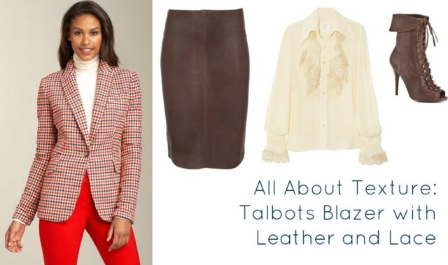 The check of this blazer is orange, hot pink, and brown on an ivory ground. Technically you could use any of the three print colors as a base (I received a mailer from Talbots that had this jacket styled with a pink shirt and brown pants). I chose brown as the connecting color to give the jacket a more traditional feel. I took advantage of the classic riding jacket silhouette and added riding boots. The denim shirt won’t compete with the print of the jacket, and a silk scarf at the throat continues the equestrian feel. Don’t worry about the scarf matching exactly – as long as it pulls one of the colors from the jacket and isn’t too loud or bright it will coordinate – look for scarves with classic prints (floral, paisley, horse bits and other riding images) to complete the equestrian chic look.