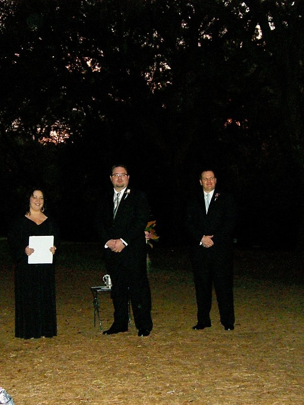 This is me before the ceremony. I am wearing my black Calvin Klein maxi dress that I wore when a Matron of Honor in September. It was in the high '70s/low '80s in Charleston so I wore it with my gold sandals from Lands End, gold dangly earrings and gold bangles. My hair was messy curls because that is what worked best with the weather and my sick state. Smoky eyes, glossy lips. For the ceremony, I wore a black pashmina that was pinned behind me so it worked sort of like a shrug.