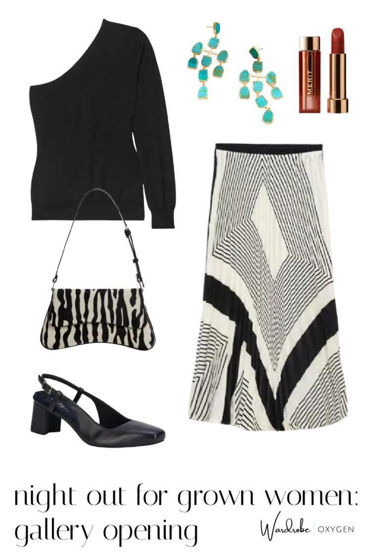 Below I share a few sample outfits for us grown women for a range of night out events we may be invited to. From bachelorettes to gallery openings, I find the one-shoulder sweater to be a great option and incredibly versatile. I believe these sample outfits could work with other types of going-out tops and hope they inspire you to see how you can achieve style on a night out while holding true to your personal style and embracing comfort and joy on your budget!