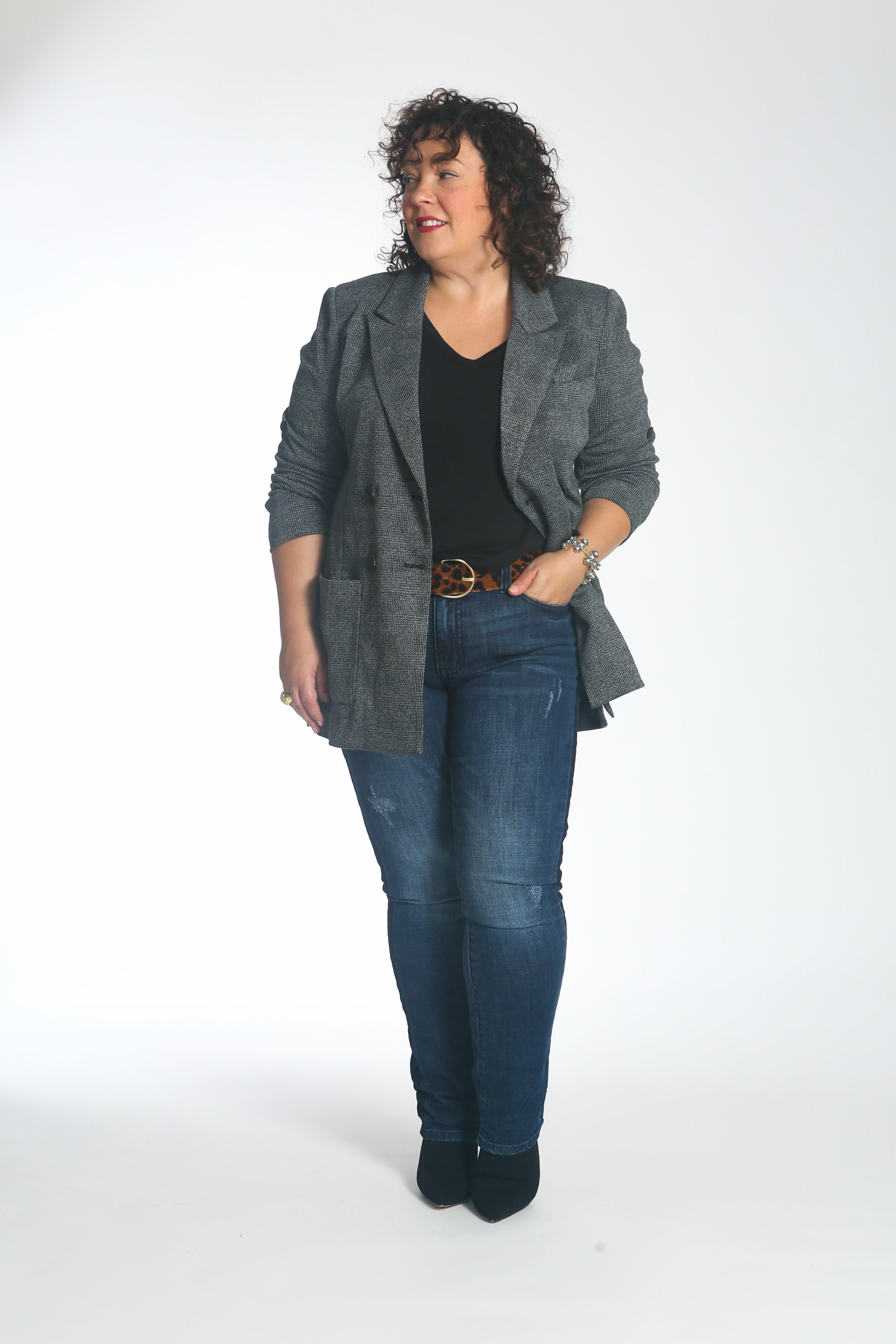 The grays in the Bond Blazer and Pivot Fitted Tee coordinate, and being both gray and black prints, looked great together. I love pushing up the sleeves of the blazer to let the stripes peek out. Since this tee is a bit shorter, it looks great tucked in but also left out.