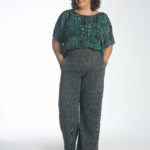 I surprised myself by loving this top. It is two lightweight layers that flow beautifully and are asymmetrical creating a very cool hem that adds modernity and a more expensive feel. The colors are gorgeous, and the blouse looks cool with leggings and a longer necklace or tucked into trousers for the office. I loved the mix of the plaid print from this top with the Bond pieces.