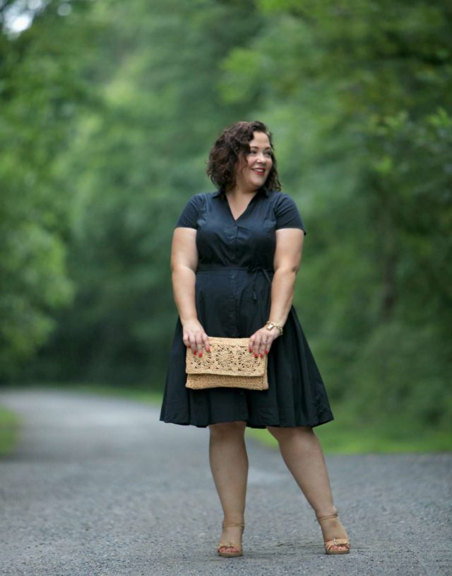 Wardrobe Oxygen in a black cotton shirt dress from ellos with Aerosoles wedge sandals and a raffia clutch bagWardrobe Oxygen in a black cotton shirt dress from ellos with Aerosoles wedge sandals and a raffia clutch bag Dress: c/o ellos (M) | Shoes: Aerosoles | Bracelet: c/o cabi | Bag: bought at a boutique years ago (similar) | Lipstick: L'Oreal ‘Eva's Red'