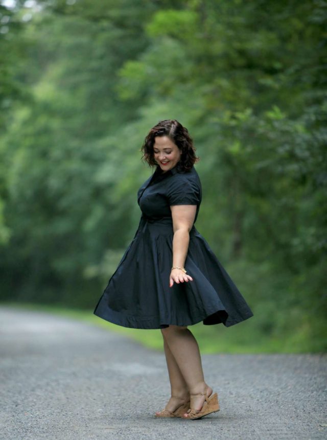 Wardrobe Oxygen in a black cotton shirt dress from ellos with Aerosoles wedge sandals and a raffia clutch bag I had a dress similar to this one years ago (see it here), but I literally wore it to death.  It got faded, threadbare in places, and I had replaced lost buttons multiple times.  It was such a perfect dress, it became my uniform back when I'd be Karl's assistant on wedding photo shoots.  I'd clamp a fanny pack on, fill my pockets with batteries and memory cards, and run around capturing shots, smoothing trains, and wrangling relatives.  I was sad to donate the dress, I never thought I'd find something similar until I saw this one at ellos.  This dress comes in five different colors/prints and goes from size 10/12 to 38/40.