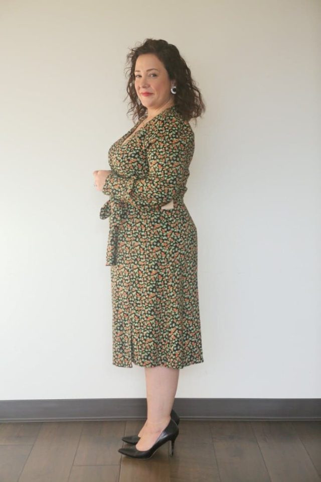 I was considering ordering this dress myself, but wasn't sure which pattern to choose (it comes in four prints and two solids). I likely wouldn't have chosen this print… but I like it! I think it would look good with black tall boots, or black tights and booties. I also think this print would look great with a denim jacket or a leather biker jacket. This is a really nice dress. It's the kind you can wear to work, but also wear for a night out. I don't have the neckline pinned, I likely would just to keep it a comfortable depth. I also think I would prefer this dress in petite as the sleeves are a bit too long. This dress isn't super stretchy like many wrap dresses; it has stretch but the fabric looks a bit more expensive and has a nice drape. I really like the cuff detail. I think I may exchange this dress for a petite. This dress retails for $99, comes in regular and petite sizes up to XXL.