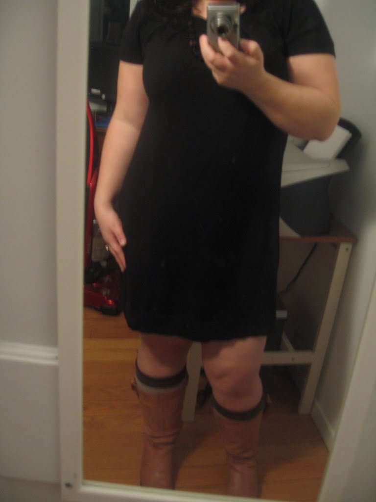 Black merino shift from Banana Republic, tan Bern boots from Duo, black, gray and olive striped cashmere kneesocks from Christmas, black coral necklace from Mexico.