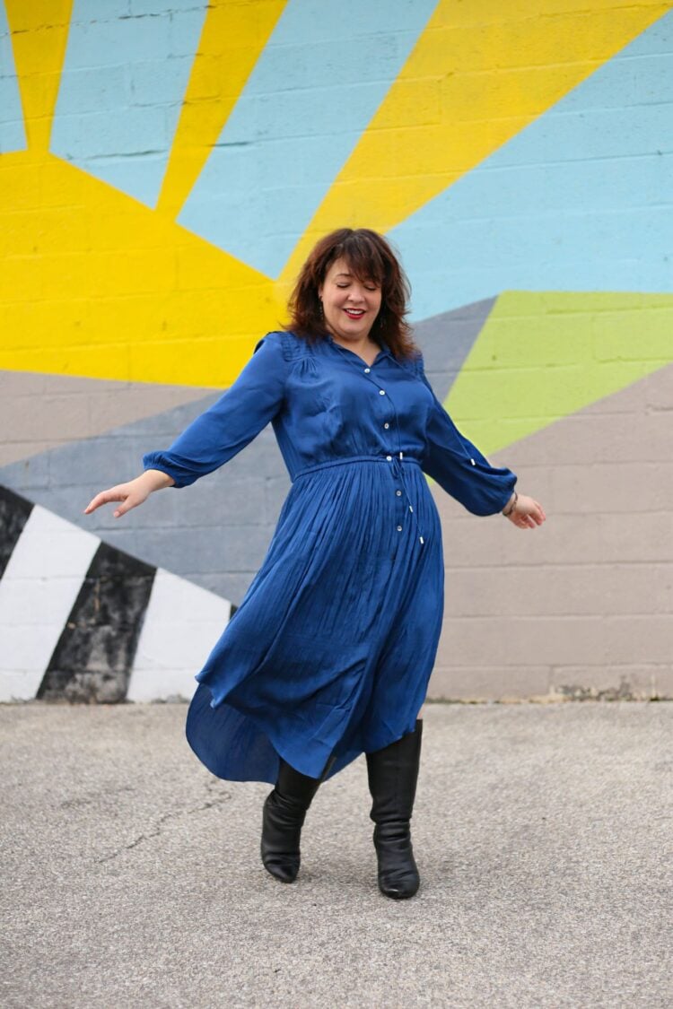 Here, I am wearing it with tall leather boots because it's winter. But with this breezy silhouette and fabric, I could see this dress with pumps or pointed-toe flats to the office in spring, with metallic sandals in early summer, and come fall with a pair of trendy sneakers and a moto jacket. You could easily cover the drawstring waist with a wide belt for a completely different effect.