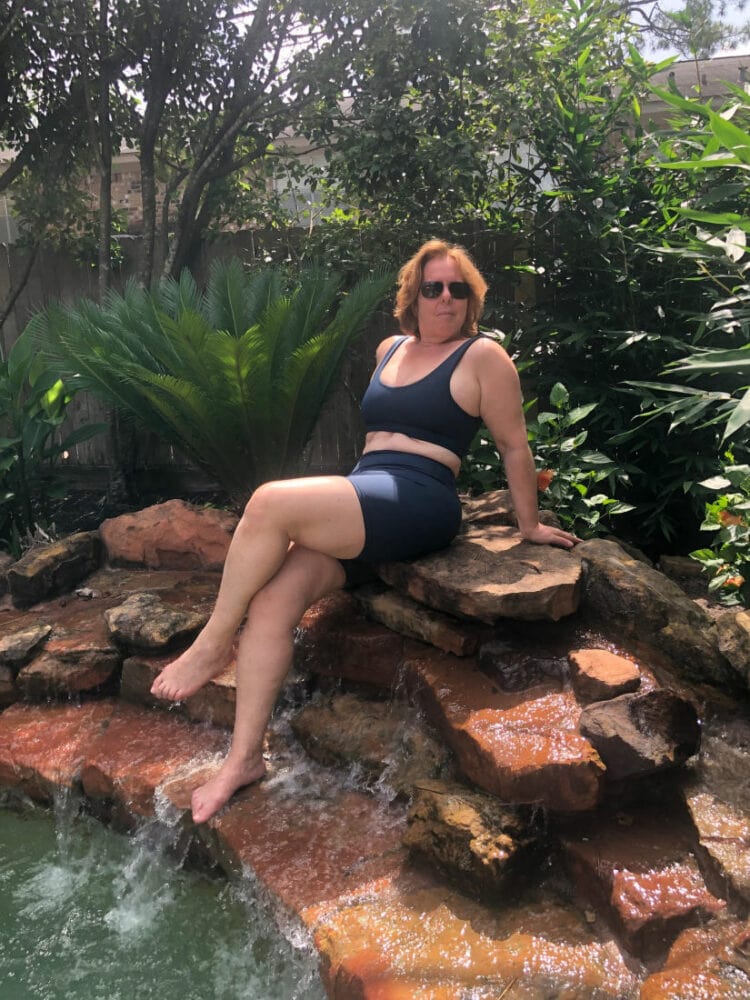 I was excited to participate in this opportunity because I’m an older woman who is neither an apple nor a pear. I consider myself a zucchini! I wanted to see my age demographic represented as well as someone who is busty and has thick legs. I ordered the Criss Cross Swim Top in a medium as I wear a 34DDD bra (size small in J Jill tops, medium in Old Navy).