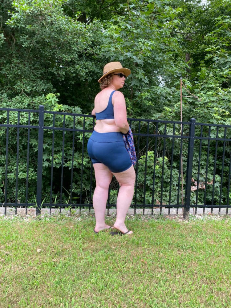 The tank-style top has enough support from the compression fabric, but somehow doesn’t smoosh my boobs into a sports bra shape, which is great! The straps are long for me, and I will be shortening them for just a bit more support and lift. This is an adjustment that I have to make to almost every bra, tank, and bathing suit I own. In my puttering and chores around the house, I did have to pull up the straps and readjust in the top, but this is most likely due to the straps being too long for me. I have enough coverage on the sides, and the torso length is good.