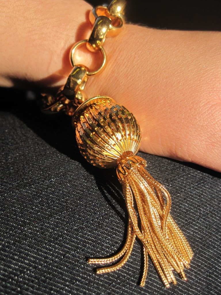 I just received the bracelet in the mail yesterday and it's so much fun! I have really had a desire lately for a charm bracelet – a big chunky brushed gold link bracelet with all sorts of unique charms. My Great Aunt had one, my mother now has it. On it is a wedding band, sorority pin, foreign coins, all sorts of cool stuff. I'd like to start one for myself but right now the price of gold is so insane. I looked on eBay and realized this is not a project I can take on right now with my budget. This is not real gold, but I have had great success with J. Crew costume jewelry (the necklace I am wearing is years old and still looks like new) so I figured this was a budget-friendly alternative.