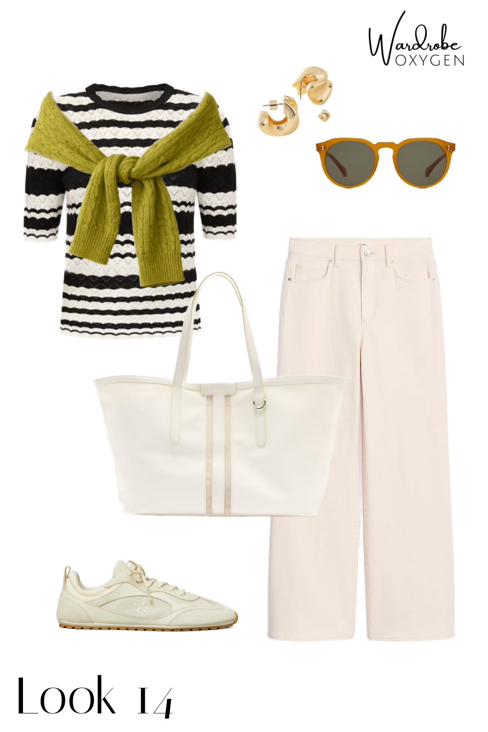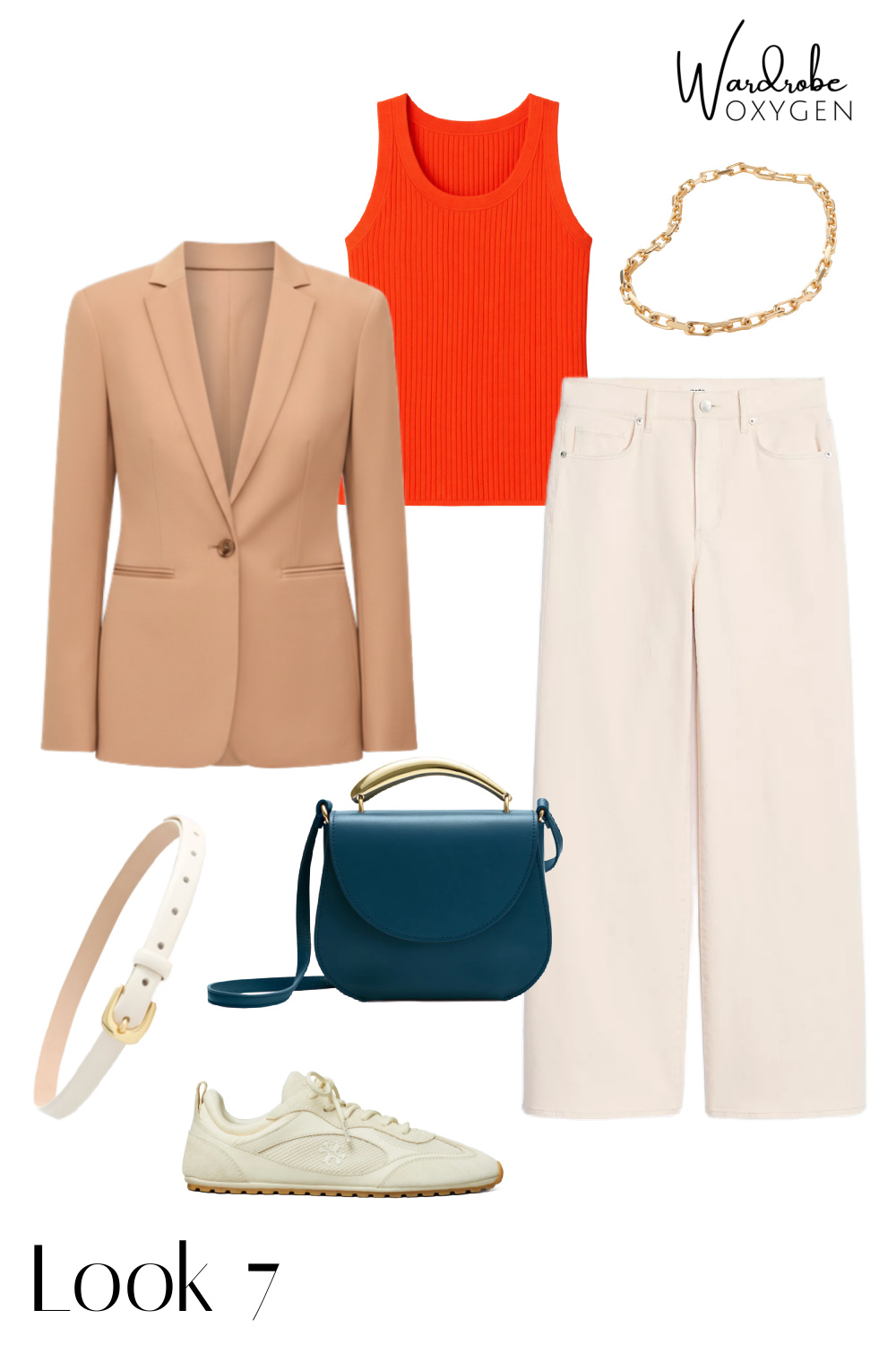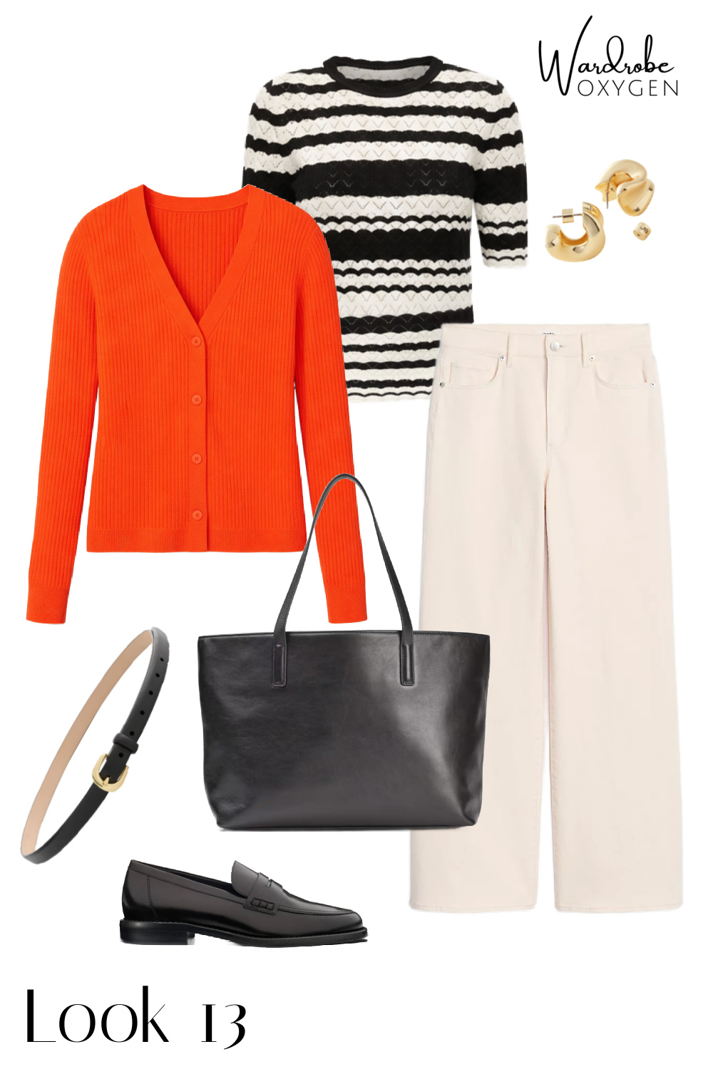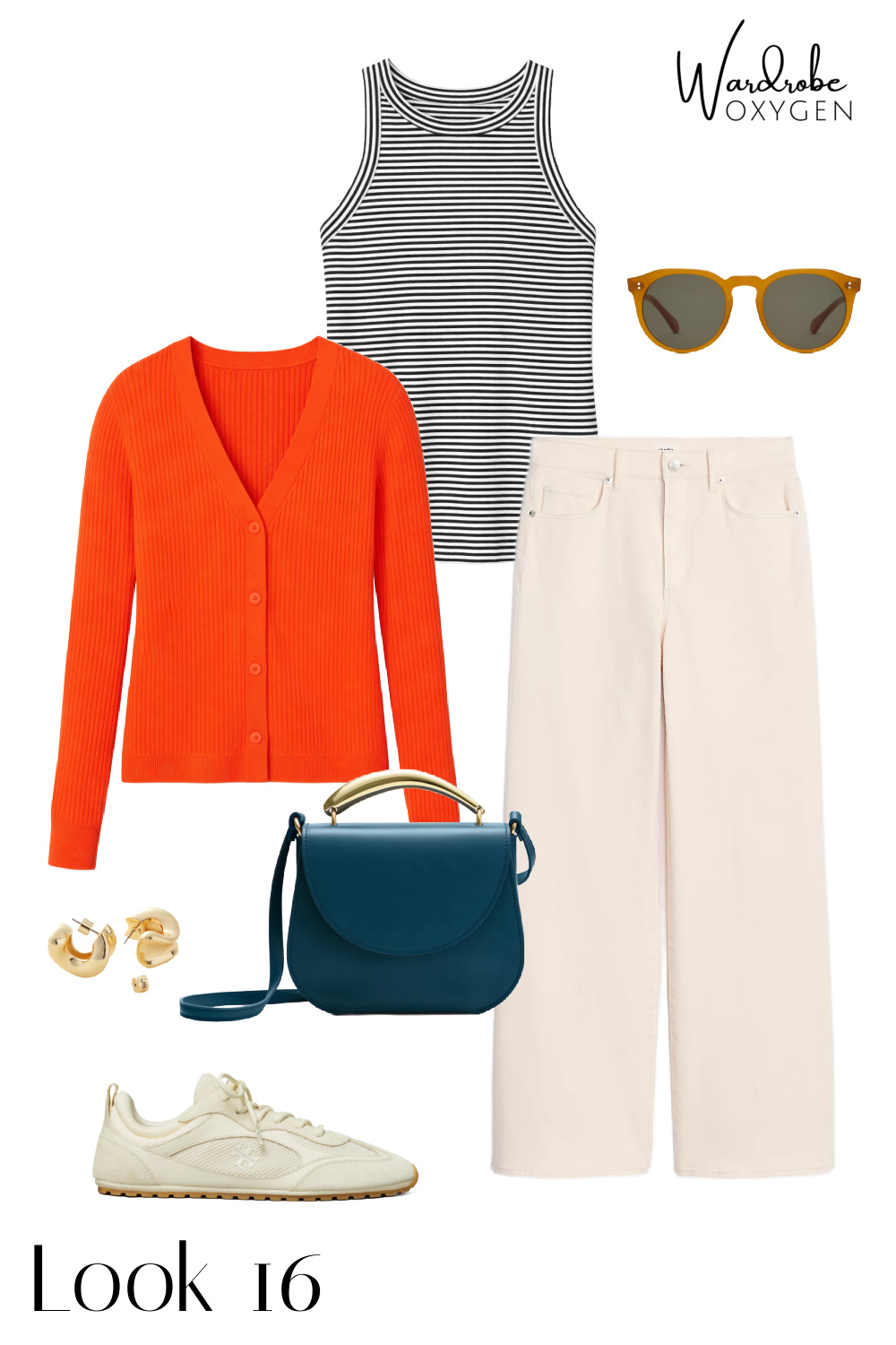 The wardrobe includes a camel blazer, camel trousers, dark wide-leg jeans, cream wide-leg jeans, a denim vest, an orange ribbed tank, an orange cardigan, a navy tee, a striped tank, a black and white striped sweater, a lime cable-knit sweater, and a white button-down shirt. Shop in the carousel below: