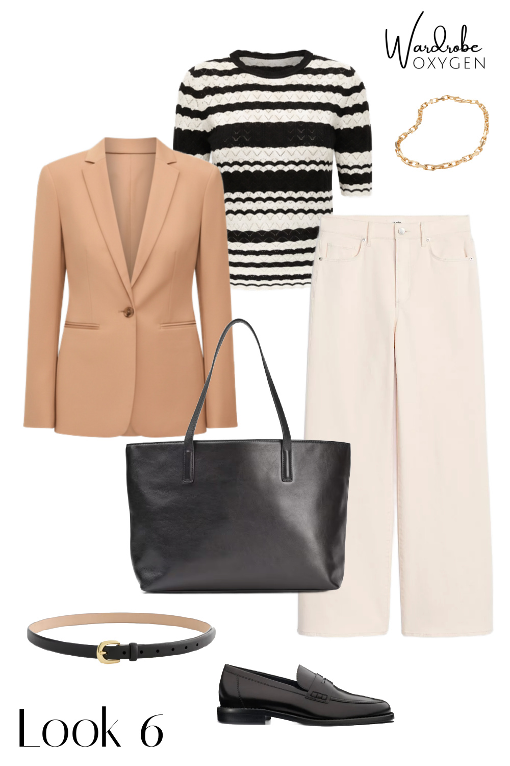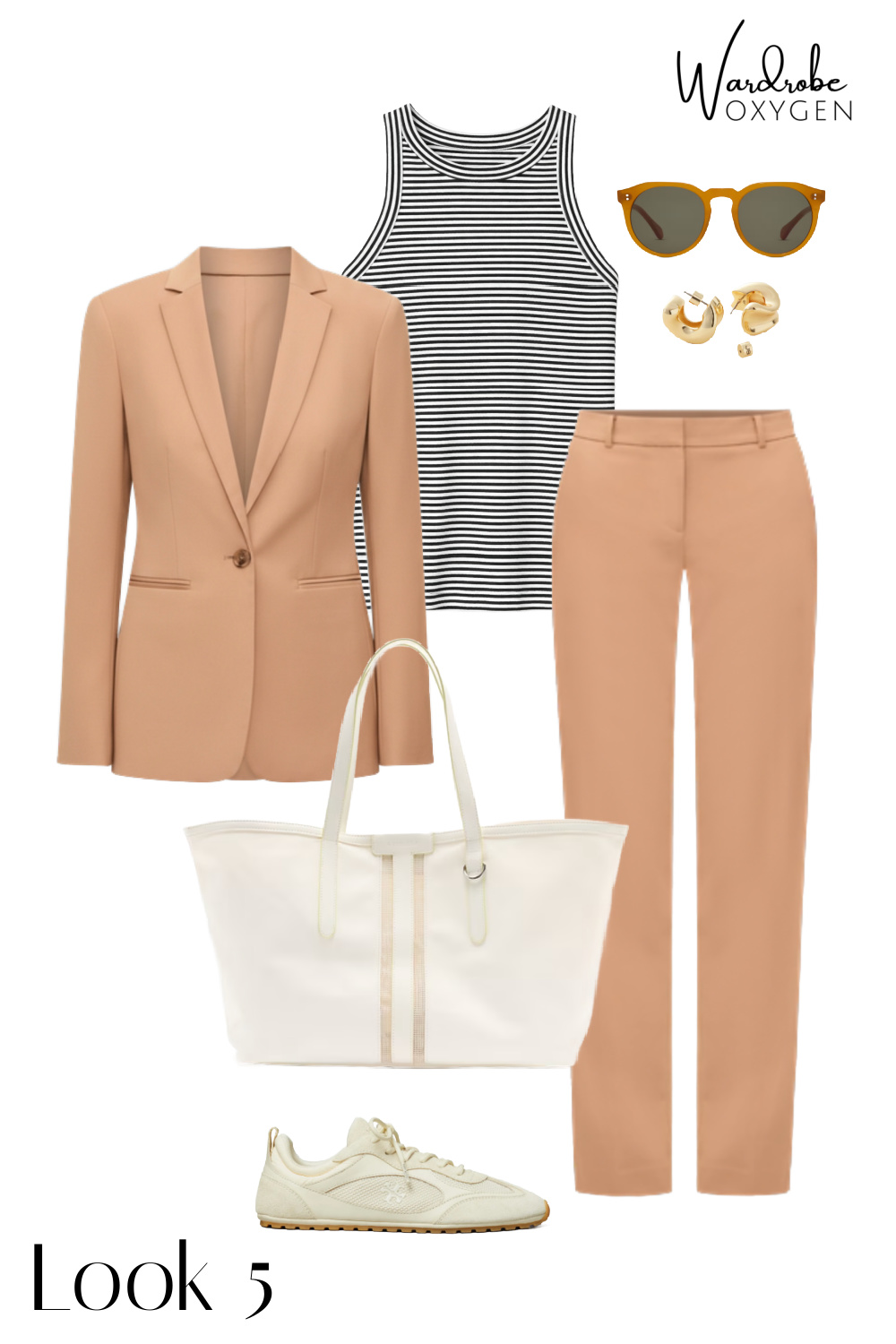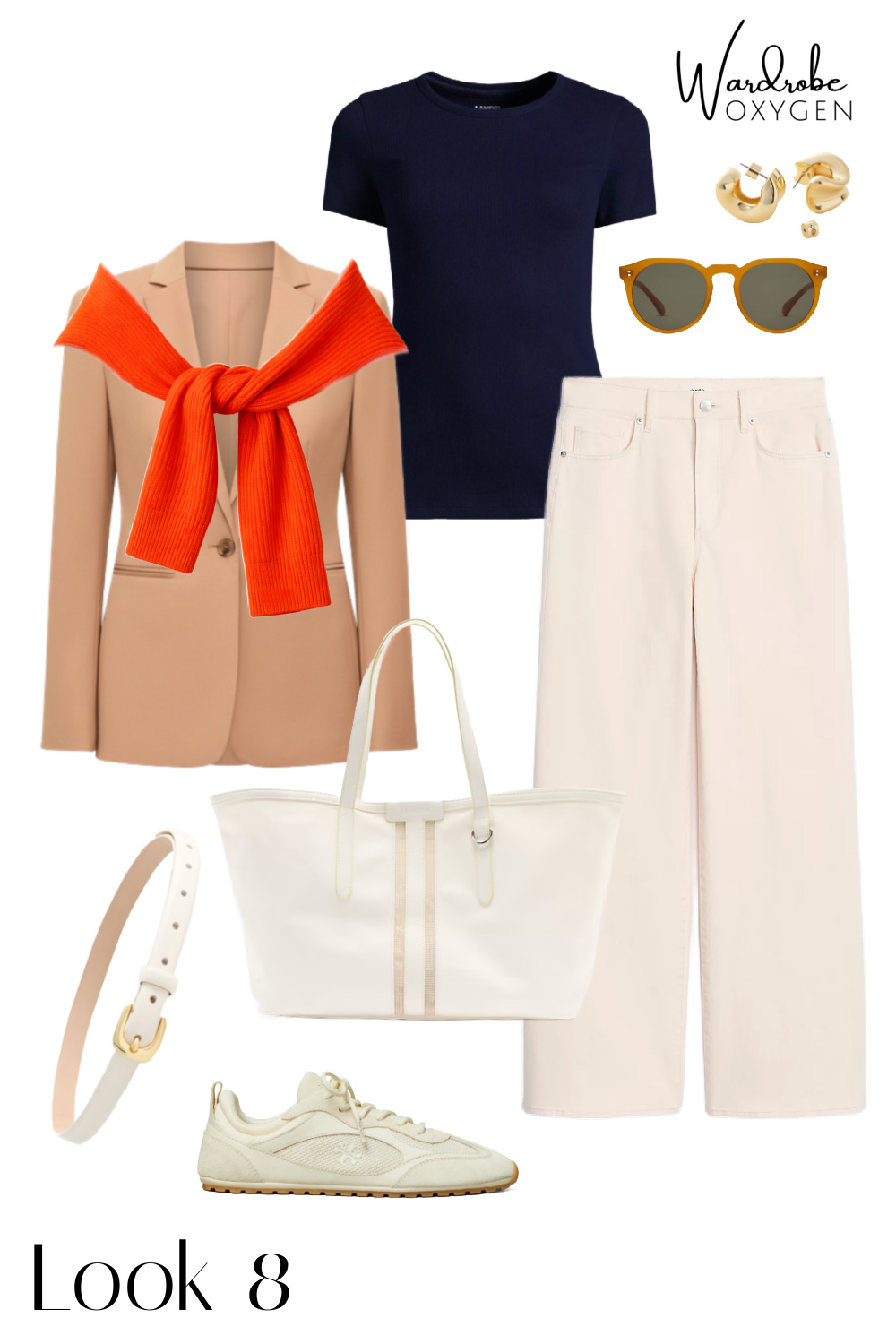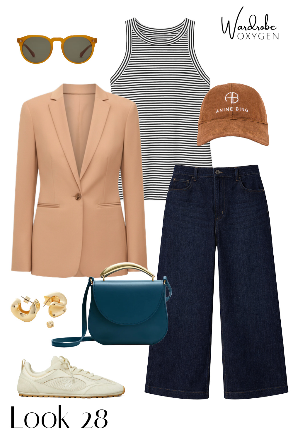 The looks move roughly from most polished (blazer + camel trousers, great for the office or a client meeting) through business casual and casual Friday territory, into true weekend looks anchored by the wide-leg dark denim. By the time you get to the final looks, the blazer is back, but this time with sneakers and a baseball cap, which honestly might be my favorite way to wear it.