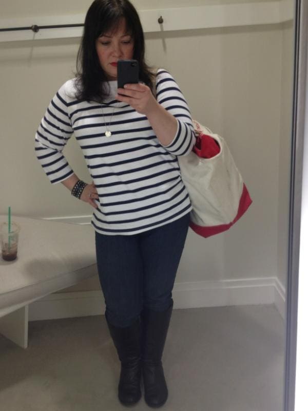 At first I considered returning it, it looked lumpy and dumpy tucked into my yellow pencil skirt, boxy with my red cropped pants. The stripes start right at my largest part and make me look like a linebacker. Then last weekend I threw it on in haste with a pair of jeans and my riding boots… and liked the effect. I wore it to the mall, the perfect experiment for the quality of a knit item. At a mall a shirt is yanked off in a fitting room, tossed into a pile on a bench, yanked back on in haste to head to the register or next shop. This shirt held up beautifully, maintaining its shape. I threw it in the wash with other knits, tumble dry medium and it came out looking exactly as it did from the shipping package.