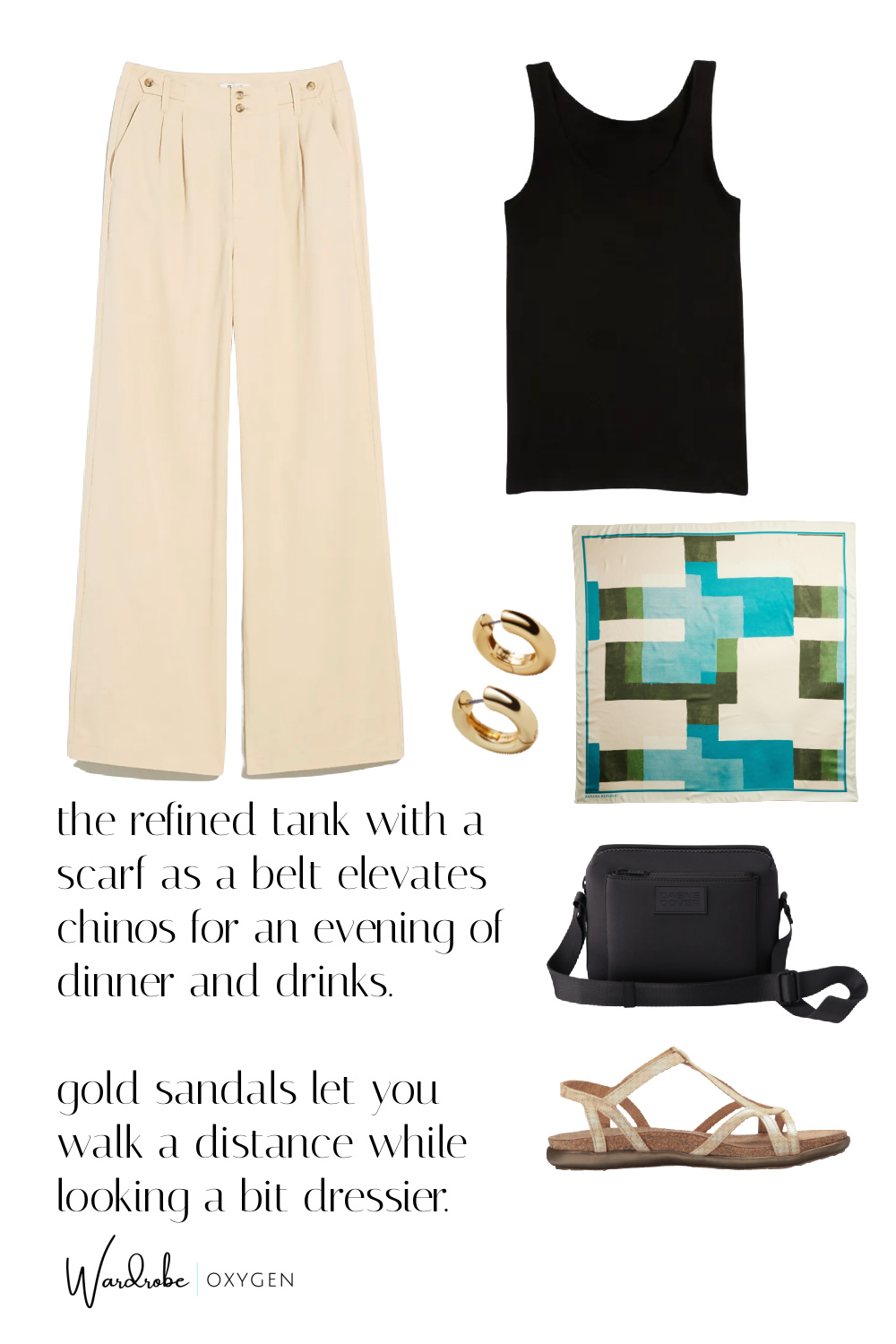 - An oversized silky scarf is a quick way to elevate a look by using it as a belt. The one I included I own in a different print, you can see it as a belt on me here with the same pants in this capsule. I also wear this scarf as a headscarf, I've tied it around my neck, it's big enough to throw over shoulders for sun protection… it's a travel must for me.