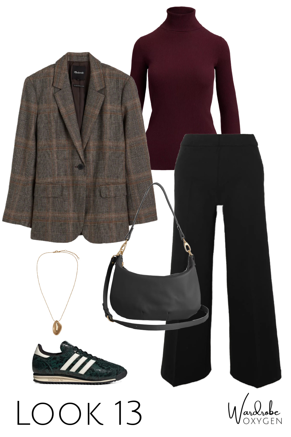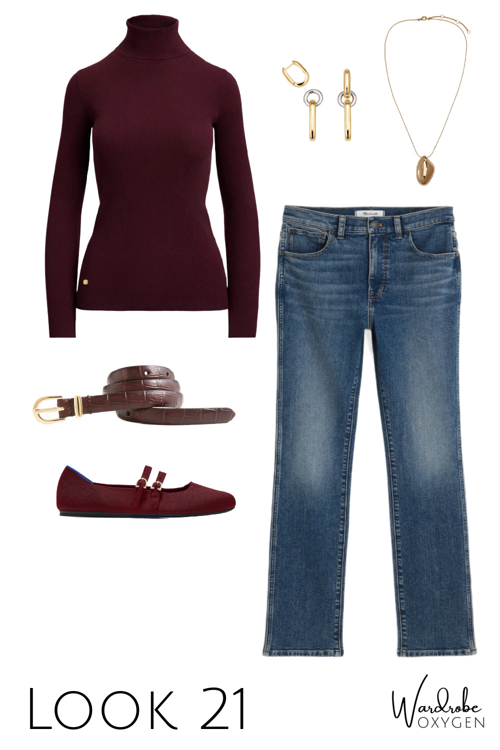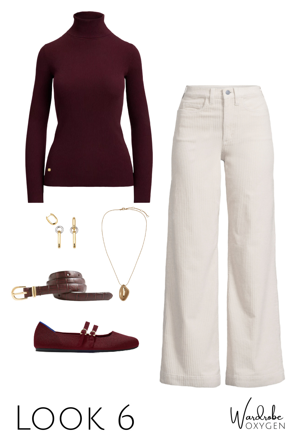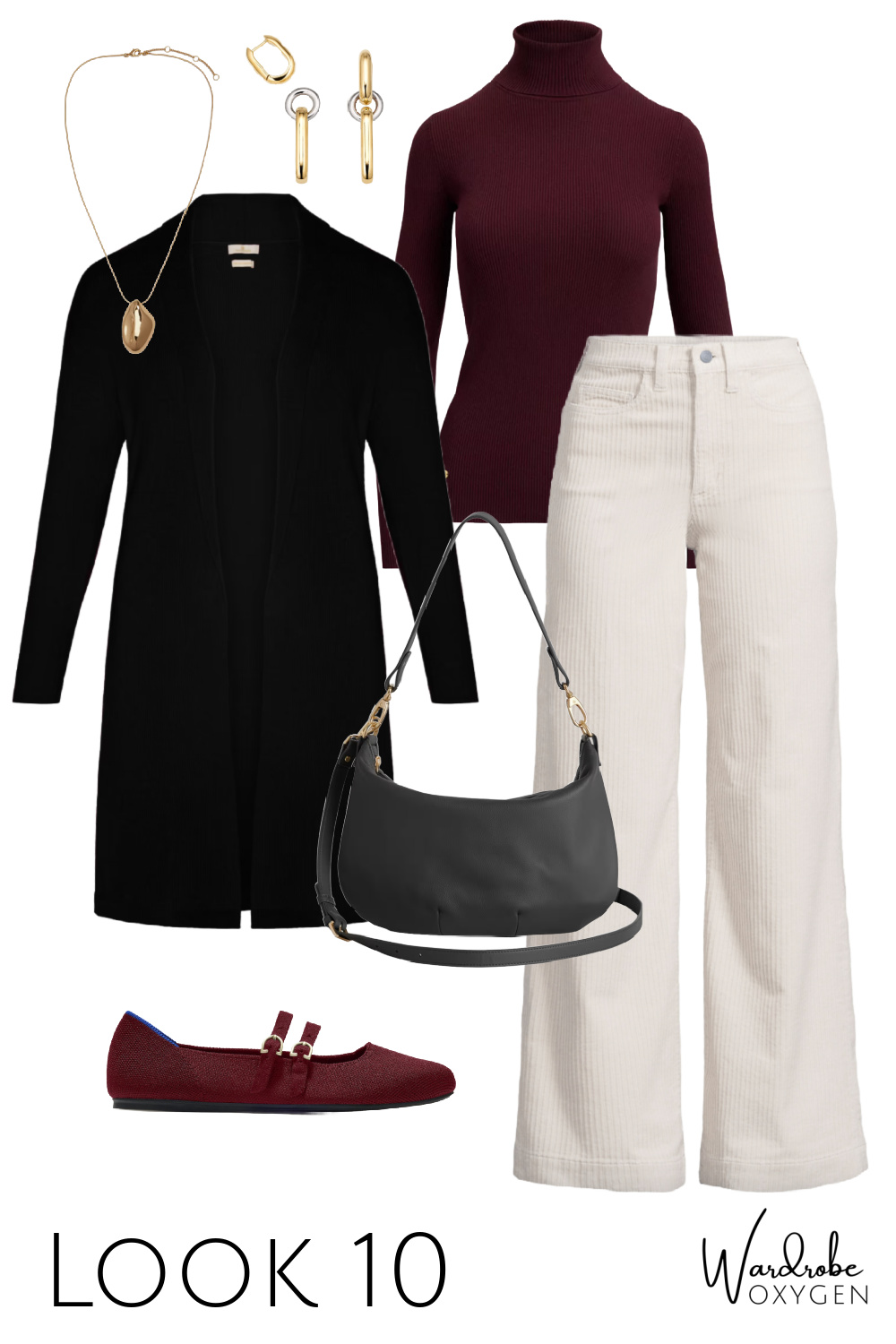 This capsule wardrobe has a base of black, but it could easily be switched out for chocolate brown. While the colors are warm autumnals, each piece could be switched out with cool tones. Replace the ivory with heather gray or navy. The burgundy turtleneck can be switched out with most any color you desire and the flats can be black, a pop of color, even a pattern like leopard or houndstooth. As for the prints, this is where you can have fun and add personality or go very simple and classic.