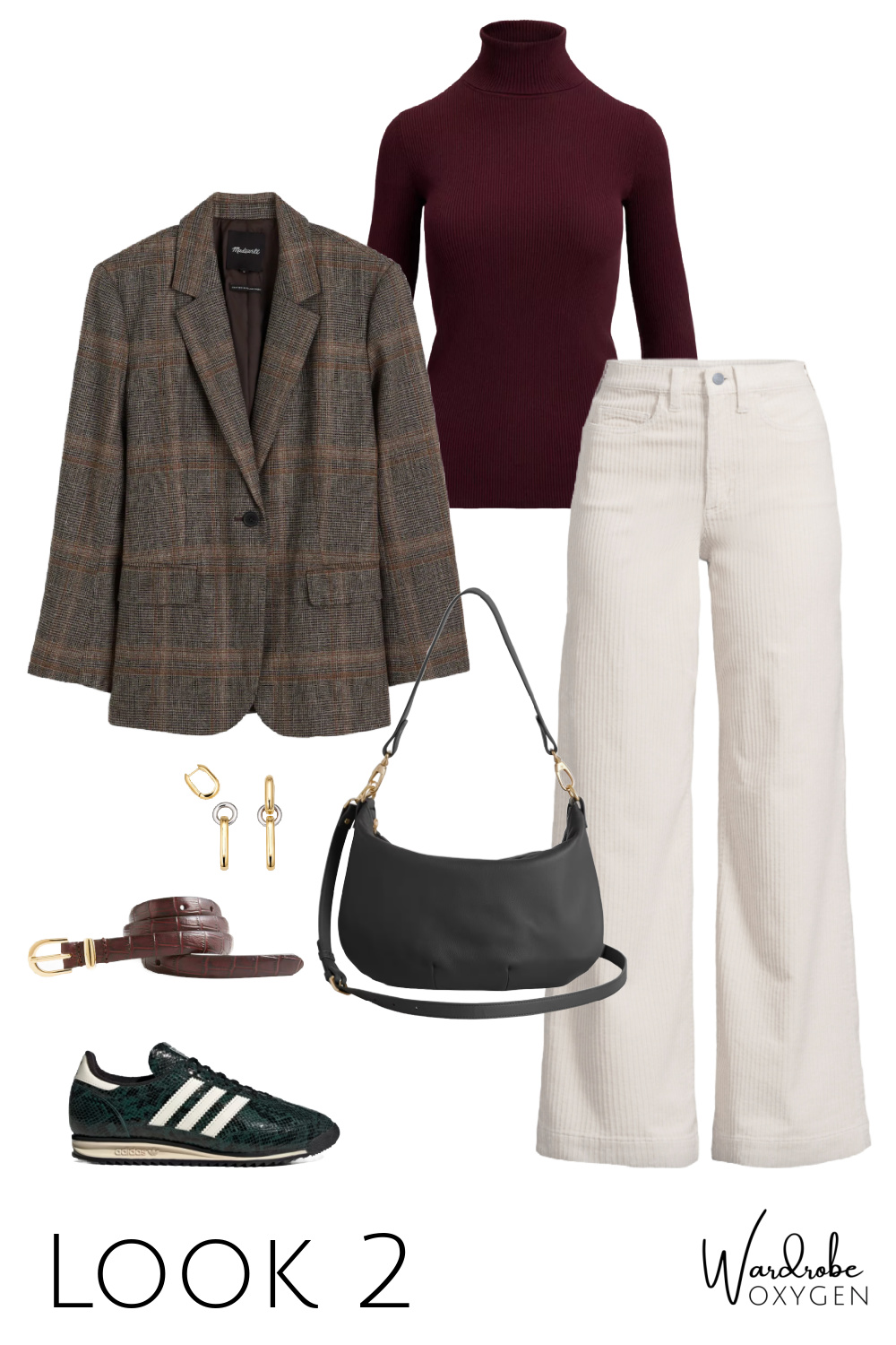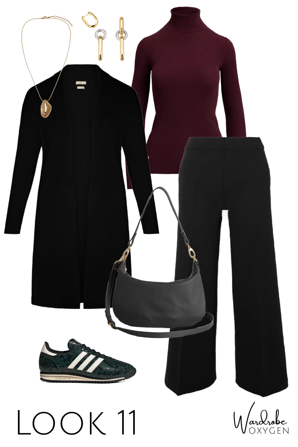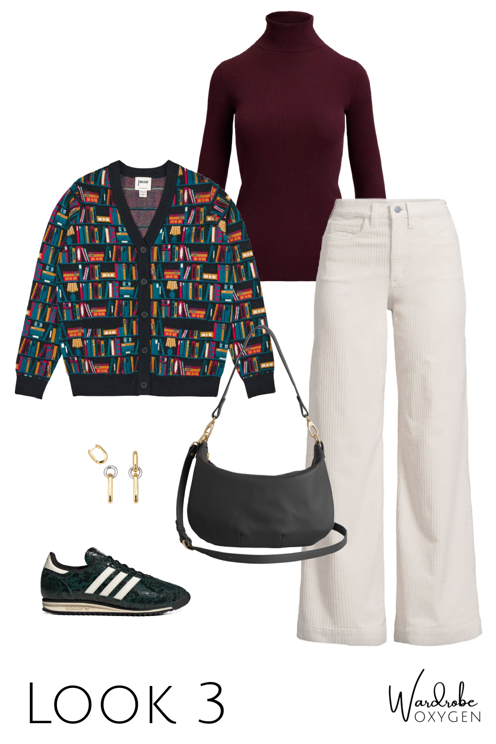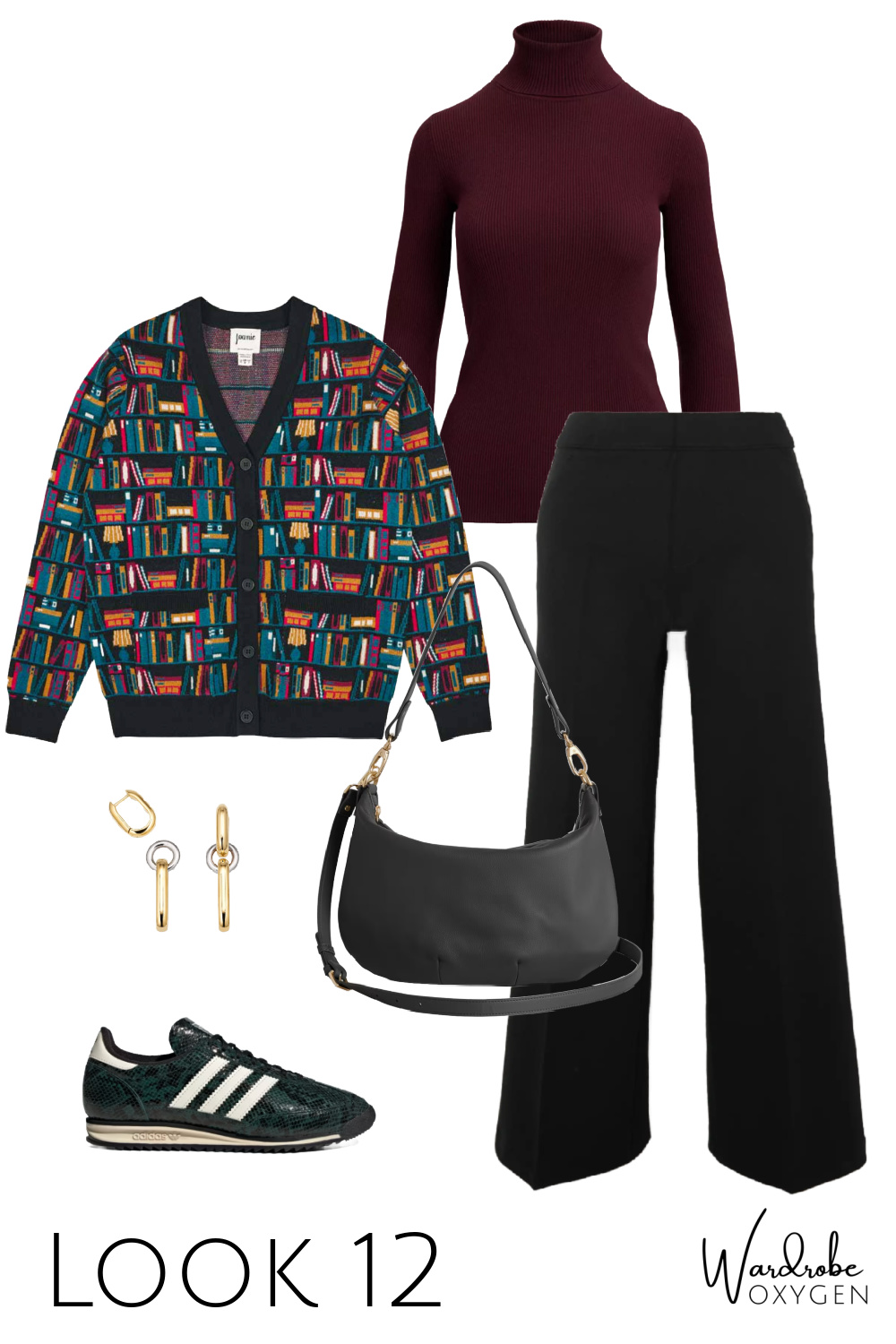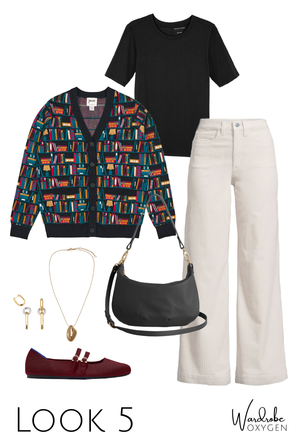 This capsule wardrobe has a base of black, but it could easily be switched out for chocolate brown. While the colors are warm autumnals, each piece could be switched out with cool tones. Replace the ivory with heather gray or navy. The burgundy turtleneck can be switched out with most any color you desire and the flats can be black, a pop of color, even a pattern like leopard or houndstooth. As for the prints, this is where you can have fun and add personality or go very simple and classic.