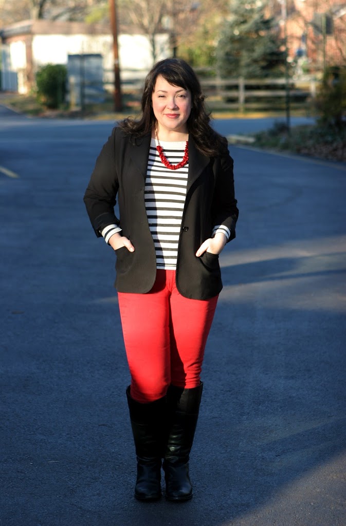 I swore I wouldn't buy anything I didn't need, and I guess I don't actually NEED this jacket… but when I saw this jacket I did fall pretty hard. Dresses up and down well, the fabric makes it work year-round, I am on a mega navy kick, and it's striped! It's actually a very nice jacket – good details like the zippered cuffs don't unzip and have fabric behind them, hematite-colored zippers so you can wear with gold and silver jewelry, fully lined, and a good fit (I am wearing a 12 regular and it zips comfortably even over my bust). I know, I'm wearing gifted Gap jeans but that has nothing to do with this endorsement of the jacket, which I paid full price for (okay, I got 10% off since it was Tuesday and had a $10 rewards for being a Banana Republic cardholder). It's just pretty fab!