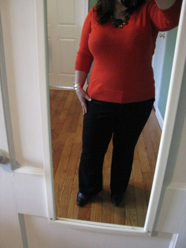 I went to Gap at lunch as well and found that their low slung flare pants fit me in a 16. They don't hurt and they don't make too extreme of a muffin top. I sat in them and they seemed to do quite well. Of course they didn't have 16 ankle in the store, so I went online and ordered two pairs – we'll see how they turn out. My maternity pants are now too big; these literally are the only pants I own that fit, and with only owning summer shoes or brown suede Mary Janes for dresses (the black suede ones rub off on my skin if I wear them with bare legs), I am feeling a bit trapped. Argh… will keep looking…
