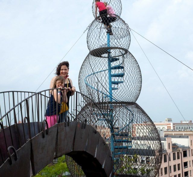 It’s worth it to buy the extra ticket to go to the roof, especially if you have kids. We could have spent all day up there! Emerson thinks back to our trip to the City Museum as an amusement park and that’s because of the roof’s activities. You can climb up into an old school bus and see the most amazing views of the city, and climb up different areas to be way high above the roof in the sky. There’s humongous slides you can ride, a fountain with stepping stones in it that Emerson adored, and an old Ferris Wheel where you can see all of St. Louis. There’s plenty of food and drink at the City Museum and we enjoyed fresh fruit frozen pops. I highly recommend getting there as early as possible; by lunchtime the place was packed so we decided to get an Uber back to the room.