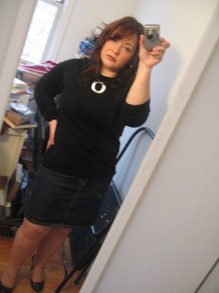 Omigoodness it is COLD today! Saturday we were running around sans coats and today it's in the 20s. Crazy DC weather! I was actually in the mood to wear some color, but the weather made me seek out warm layers and that ended up being more black. I love this skirt because it's a sweater so it's warm, but it's a tad big and rides up. I didn't realize until after these pictures how much it had ridden up, swear that here in the office it's down near my knees. And don't worry folks, my heavy Lands' End parka, hat, scarf, and gloves were waiting for me in my warm car to my left.