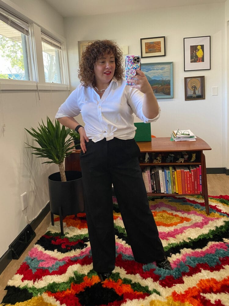 If you follow me on Instagram, you know I had a lot of stories about this white shirt from Chico's. It is an awesome shirt; you don't need to iron it, it's opaque yet silky and soft but also crisp, it fits my bust and shoulders, it makes me like button-front shirts. And at the time of writing this, it's 30% off. For reference, I am wearing Chico's size 2. It is tied in a square knot, just making sure the outside of the placket side is folded over first to have the space between buttons and tie smaller/less stomach showing.